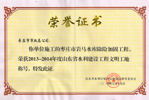 “棗莊市巖馬水庫除險加固工程”榮獲2013—2014年度山東省水利建設工程文明工地稱號