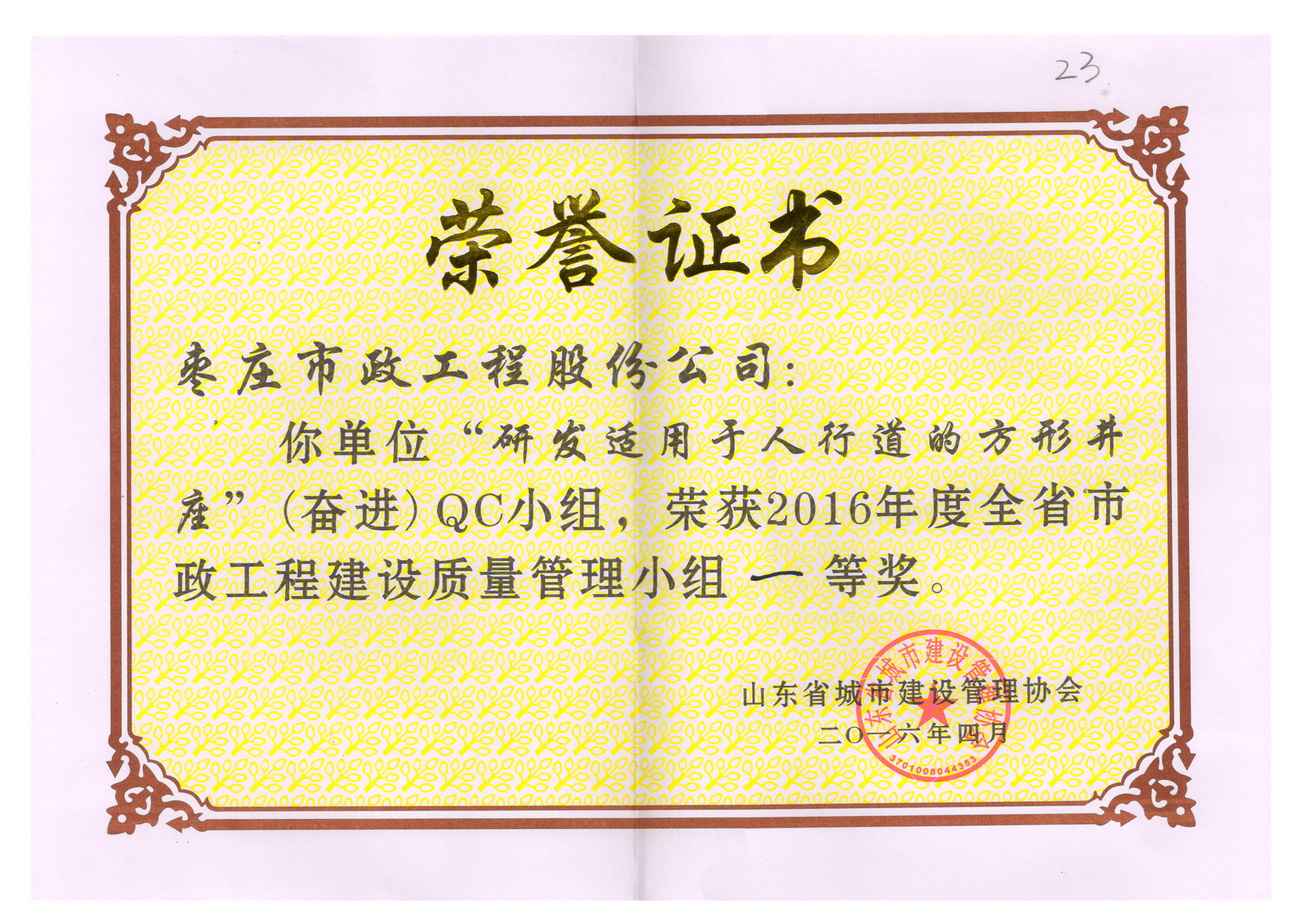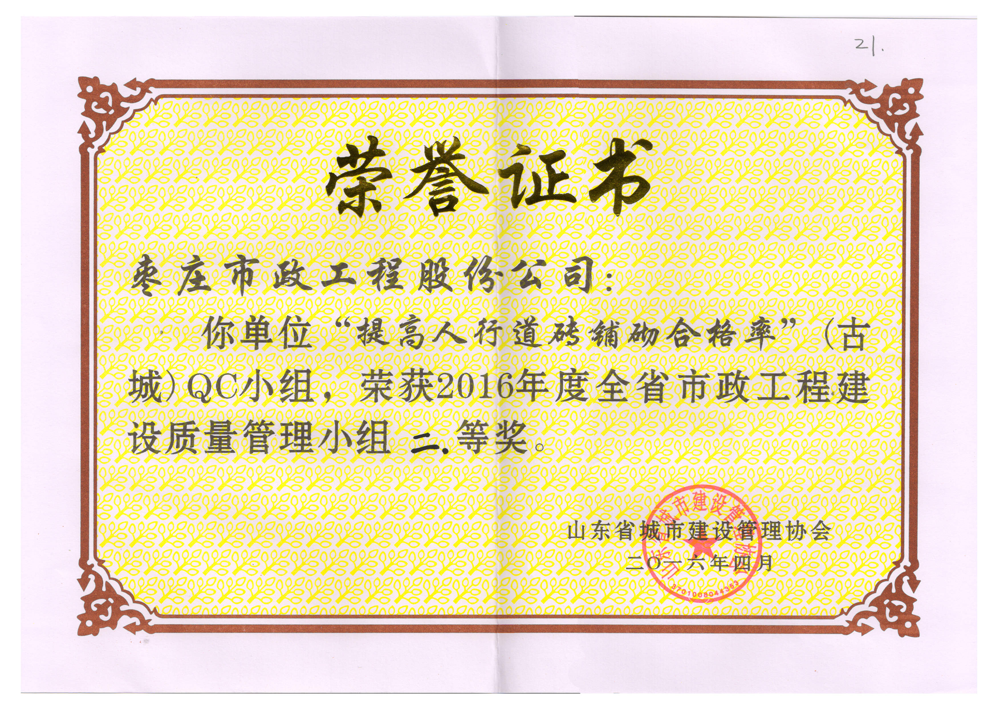 4月22日,由姚洪晉副總經(jīng)理帶隊,路橋一公司奮進QC小組、路橋二公司古城QC小組參加了2016年全省QC成果發(fā)布會。一公司申報的“研發(fā)適用于人行道的方形井座”和二公司申報的“提高人行道磚鋪砌合格率”兩項QC成果,分別榮獲2016年度全省市政工程建設質量管理小組一、二等獎。